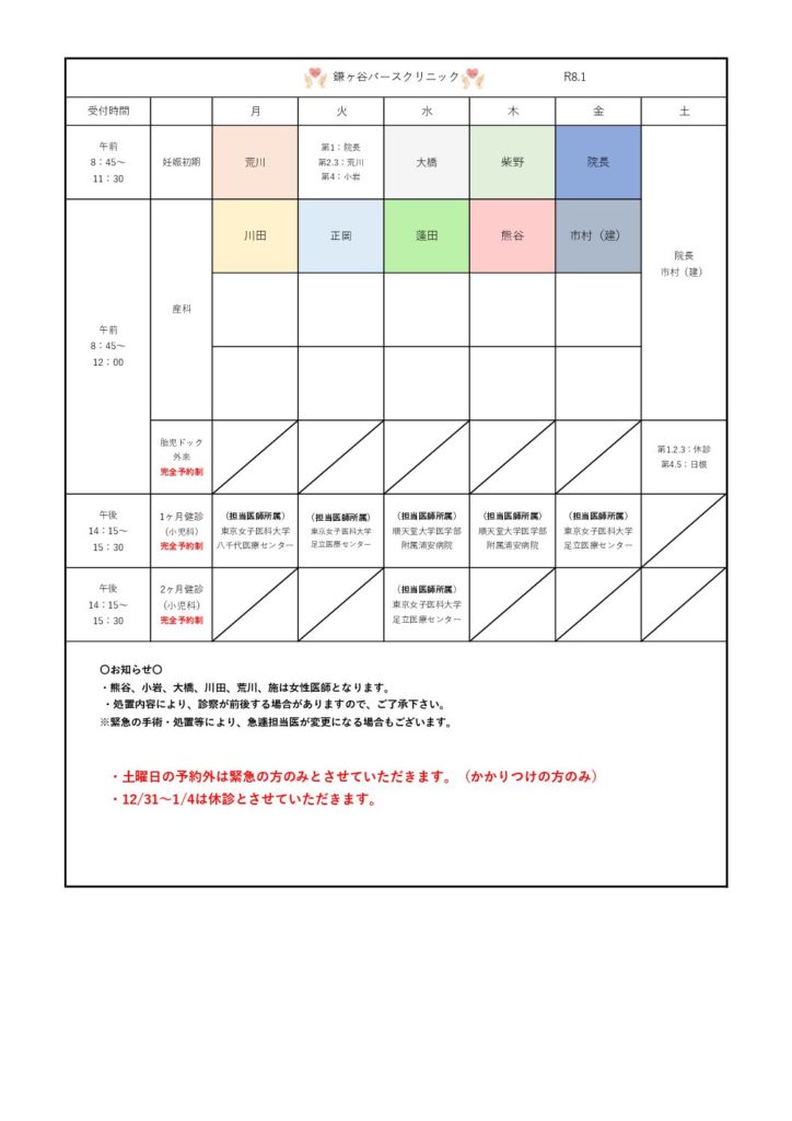 1月外来担当医表